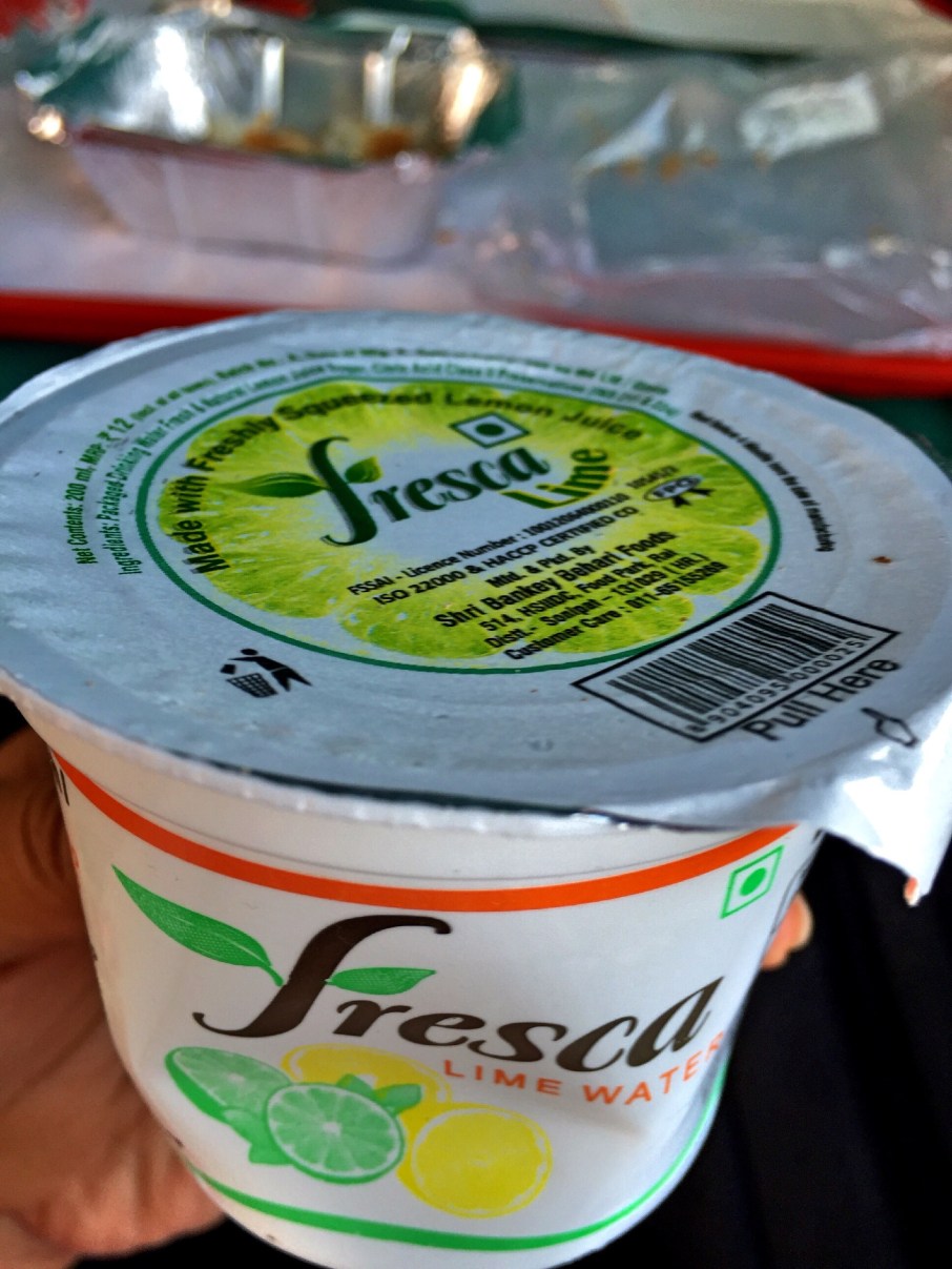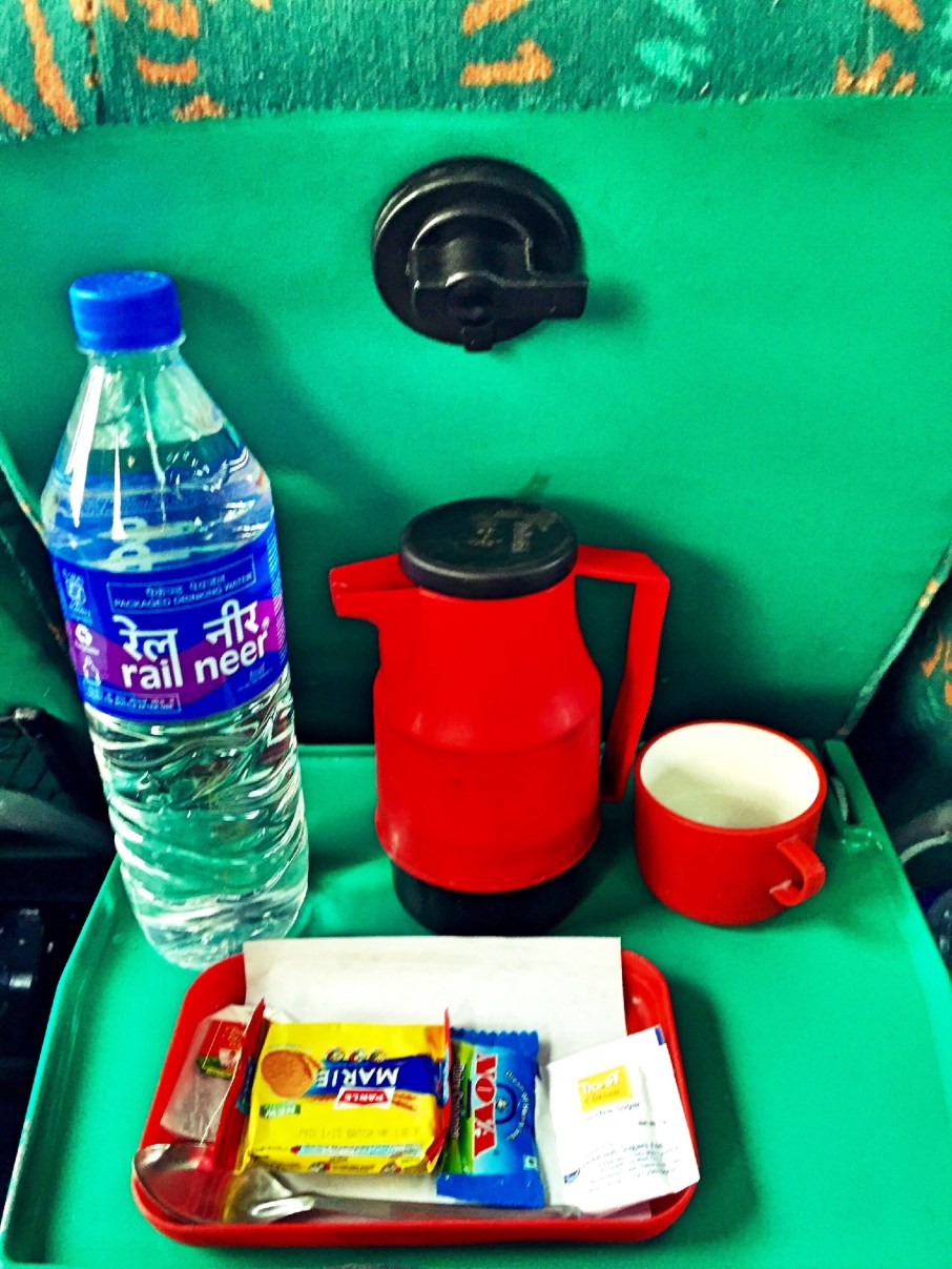 As soon as the train departed, a guy gave out news papers (Hindi and English version), served bottle of water and a small tray consists of a packet of biscuit, tea, creamer and sugar. It was followed by a cup and a thermos with hot water.